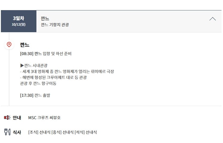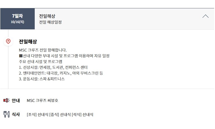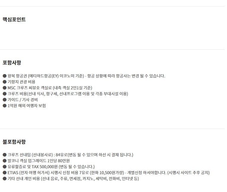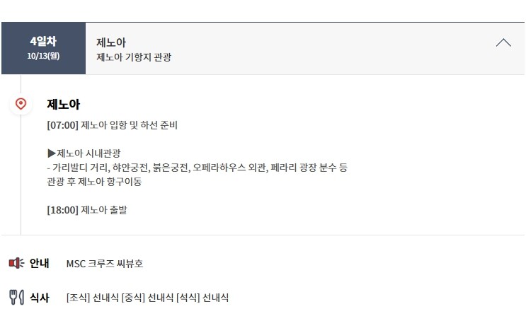 고객님들의 만족과 편리함을 위해 기항지 관광의 대부분을 선사프로그램이 아닌 직접 수배 및 진행을 하고 있으나 간혹 천재지변, 풍랑, 날씨에 따라 선사가 입/출항을 못하는 경우가 발생 되는데 이 경우 선사의 권한으로 현장에서 일정이 변경 되기 때문에 기항지 관광에 대한 환불처리는 불가합니다.[항공권 발권] 빠른 발권 요청이 진행될 수 있으며, 발권을 못하는 경우, 항공좌석 불가 또는 운임이 상승 될 수 있습니다.[항공스케줄] 항공 스케줄은 항공사의 사정에 따라 변경될 수 있습니다. 출/도착 스케줄은 해당 도시의 현지시간 기준입니다.[관광지입장] 내부 관람으로 표기된 입장지 외의 장소는 외부 관람으로 진행됩니다.[국적] 대한민국 국적이 아닌 경우, 방문 국가의 비자관련 사항을 대사관에 확인해주시기 바랍니다.